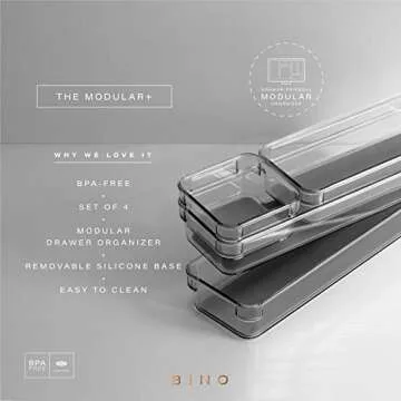 Show more Discover the ultimate solution for maintaining order in your home with the BINO 4-Piece Drawer Organizer Bin Set. This stylish set, designed in a chic grey finish, marries functionality and aesthetics, providing you with versatile storage options that can be adapted to any room. Each bin is crafted from high-quality, durable plastic that guarantees longevity whether you're organizing your desk, vanity, or any other space that needs a touch of tidiness. They feature soft-grip linings and non-slip rubber feet, ensuring that your items remain securely in place, eliminating the struggle of disorganized drawers. Rounded corners enhance the usability of these bins, making them easy to handle and clean, adding further convenience to your everyday life.