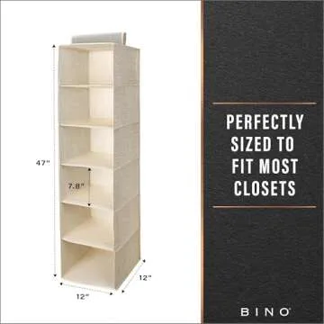 Introducing the BINO 6-Shelf Sweater Closet Organizer in a lovely beige that seamlessly combines functionality with a stylish design. This versatile hanging organizer is perfect for maximizing your closet space and is tailored for those who crave organization and ease. With dimensions of 11.8"L x 11.8"W x 47.25"H, it provides ample room to store a variety of clothing items including sweaters, shirts, towels, and accessories. The six breathable pockets are designed to keep smaller items like...