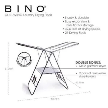 If you've ever struggled to find a reliable and spacious drying solution, look no further than the BINO Gullwing Steel Drying Rack. Perfectly designed for air drying a variety of garments, this foldable rack offers an impressive 42.5 feet of drying space with 21 rods that accommodate everything from delicate blouses to hefty beach towels. Crafted from durable materials, the Gullwing maintains a balance of strength and lightweight portability, making it easy...