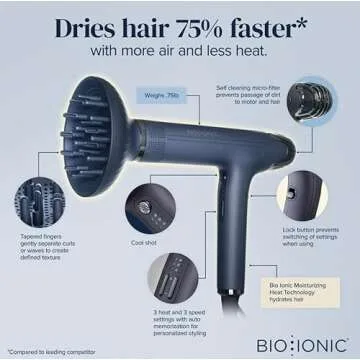 Show more Experience a revolution in hair drying with the Bio Ionic High-Efficiency SMART-X Hair Dryer. This innovative blow dryer is designed to dry your hair 75% faster, thanks to its increased air pressure and reduced heat. Say goodbye to frizz and hello to smooth, healthy locks as the SMART-X technology works its magic. The included diffuser gently lifts and shapes your natural hair texture, allowing you to embrace your unique style with ease.