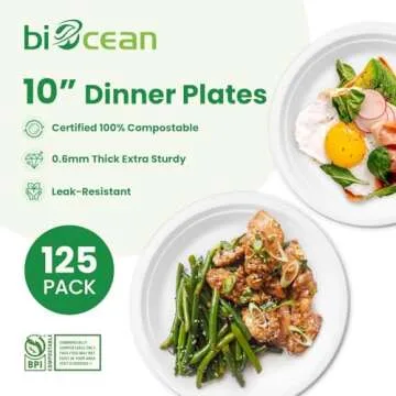 Biocean 10 Inch Compostable Plates - 125 Pack of Eco-Friendly Heavy Duty Plates