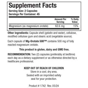 The recommended dosage is two capsules per day, providing 1000mg of magnesium orotate.