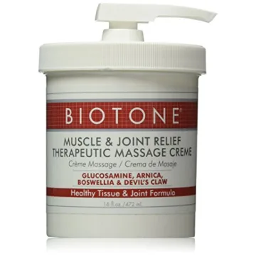 Show moreExperience unparalleled relief and rejuvenation with the Biotone Muscle and Joint Relief Therapeutic Products Massage Creme. This 16-ounce therapeutic cream stands out as a top choice for both personal use and professional applications. Crafted with a unique blend of nature's healing ingredients such as arnica, quince, burdock, and glucosamine sulfate, this premium formula not only alleviates discomfort in muscles and joints but also nourishes your skin. Forget the stickiness of traditional lotions and the mess of oils; this luxurious cream offers a non-sticky texture that transforms the application into a soothing experience, ensuring you can focus on what matters - your wellness.