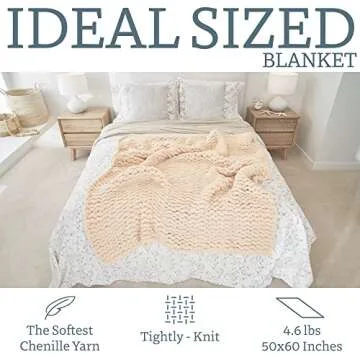 BIRCHIO Beige Extra Soft Chunky Knit Blanket Throw, 100% Hand Knit with Chenille Yarn, Super Fluffy and Extra Soft, Big Throw Blanket (Beige,50 * 60inch)
