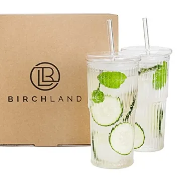 Experience the purity of your favorite beverages with the Birchland All Glass Iced Coffee Cup. This set of two 18 oz ribbed glass tumblers comes with a lid and straw, designed to enhance your drinking experience without the interference of plastic or metal. The all-glass construction ensures no stains or odors, while the food-grade silicone ring on the lid guarantees a snug fit. Perfect for iced coffee, tea, smoothies, or protein shakes, these tumblers are not only stylish but also environmentally friendly,...