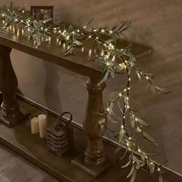 Show more Transform your living space into a cozy sanctuary with the enchanting Birchlitland Olive Leaf Garland with Lights. This stunning garland features up to 96 warm white micro LED bulbs entwined within a collection of rich, textured olive leaves, creating a subtle glow that illuminates your home, adding warmth and charm to any holiday decor. Whether it graces your fireplace, wraps around a dining table, or decorates a bedroom wall, its radiant light will capture attention and set a delightful ambiance.