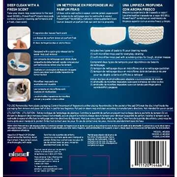 Comes with: four spring breeze scented discs, one soft mop pad for everyday cleaning, and one soft microfiber mop pad with scrubbing strips for pesky, tough messes