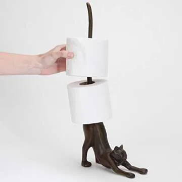 Show more Transform your kitchen and bathroom into a delightful haven with our charming cat-themed Paper Towel and Toilet Paper Holder. This unique accessory combines practicality with artistry, featuring a striking cast iron construction finished in a gorgeous bronze hue, making it suitable for various decor styles. The whimsical design, showcasing a stretching cat, not only adds a playful touch but also embodies sturdy functionality. Standing at 17 ¾” tall and measuring 3” wide x 7 ½” long, this holder effortlessly accommodates a full roll of paper towels in the kitchen or up to three rolls of toilet paper in the bathroom.