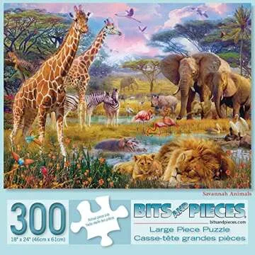 Show more Discover the charm and intricacies of the "Savannah Animals" 300-piece jigsaw puzzle from Bits and Pieces, crafted by the talented artist Jan Patrik. This stunning artwork captures the essence of wildlife in the serene environment of the Savannah, bringing the beauty of nature into your home. Designed for both adults and families, this puzzle offers not just a challenge, but an adventure for your creativity and patience. Imagine the satisfaction of piecing together this beautiful scene—perfect for rainy days, family nights, or as a relaxing solo endeavor. Each piece contributes to a magnificent final artwork that measures 18" x 24", making it a showstopper once completed and a perfect candidate for framing.