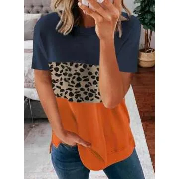 Biucly Women's Color Block Leopard Print T-Shirts Summer Sexy Short Sleeve Crewneck Loose Tee Tops T Shirt for Womens 2025,US 18-20(2XL),Blue,Panther,Orange