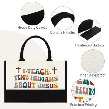Show more Introducing the **BiuNiuring Teacher Tote Bag**, a thoughtful and unique gift designed to show appreciation to the incredible educators in our lives. This stylish tote is not just a bag; it embodies gratitude, making it a perfect thank-you gift for teachers. With its charming inscription, "I Teach Tiny Humans About Jesus," this tote bag strikes a heartfelt chord, ensuring your teacher feels valued for their hard work and dedication. Made of premium-duty canvas, this tote bag boasts both durability and elegance, making it a long-lasting companion for daily use.