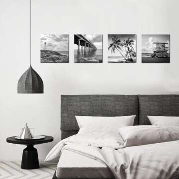 Biuteawal- 4 Piece Wall Art Back White Beach Picture Canvas Print Florida Coastline Lighthouse Lifeguard Tower Pier Poster Print Streched Framed Artwork Living Room Bedroom Bathroom Deco