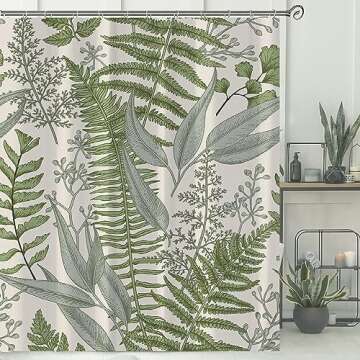 Show more Transform your bathroom into a serene oasis with our stunning plant shower curtain, crafted from premium quality polyester fabric. This shower curtain boasts a soft and comfortable texture while ensuring durability with features like no fading and no odor.