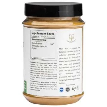 Show more Experience the power of ancient wisdom with Bixa Botanical Haritaki Powder, renowned as the "king of herbs" and a cornerstone of Ayurvedic medicine. Sourced from the dried fruit of the Terminalia chebula tree, this herbal supplement embodies the rich tradition of wellness. Each 200-gram/7-ounce package contains 100% pure, steam treated Haritaki, ensuring you receive the highest quality ingredients without any artificial flavors, colors, or preservatives. Bixa has dedicated over 147 years to crafting herbal supplements that honor Ayurvedic principles with integrity and potency.
