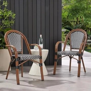 Show more Introducing the BKSFOAA French Bistro Chairs Set of 2 – the perfect blend of style and functionality for your outdoor space. Inspired by the elegant cafes of Paris, these chairs are designed to transform your patio, garden, or porch into a chic retreat. Crafted with a robust double tube aluminum frame, these chairs are not only lightweight and easy to move but also durable enough to withstand the elements. The stunning bamboo print finish brings a trendy, natural touch that enhances the beauty of your outdoor decor while ensuring the chairs remain a stylish focal point in your setting.