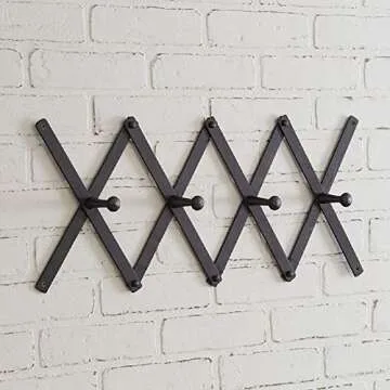 Show moreIntroducing the versatile and stylish 370418 Accordion Coat Rack, a must-have accessory for any entrance or hallway. This sleek black coat rack is not just a practical solution for hanging your favorite outerwear, but it also serves as a chic decorative element that enhances your home's aesthetic. With a width of 37 inches and a compact design, this coat rack fits perfectly in any space, making it ideal for small apartments or larger homes alike.