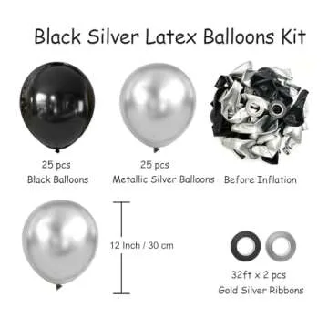 Show moreElevate your celebrations to new heights with our exquisite Black and Metallic Silver Balloons Decoration Kit, designed for those who appreciate elegance and style. This comprehensive 50-piece kit boasts an impressive assortment of 20 metallic chrome silver balloons, 5 silver confetti balloons, and 25 classic black balloons. Each balloon inflates to approximately 12 inches, ensuring a striking visual display that will captivate your guests and leave a lasting impression on everyone attending your special event.
