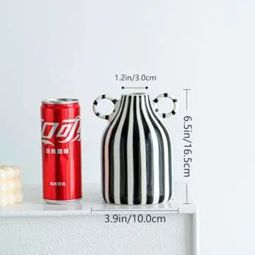 Show moreDiscover the perfect blend of artistry and functionality with our Black and White Ceramic Vase, an exquisite addition to your home decor. This mid-century modern striped vase boasts a striking black and white design that enhances both aesthetic appeal and contemporary charm. Crafted from premium ceramic, this stylish vase stands 6.5 inches high and measures 3.9 inches in length and width, making it the perfect size for any tabletop. Whether placed on a dining table or kitchen countertop, this vase is sure to grab attention and elevate your decor.