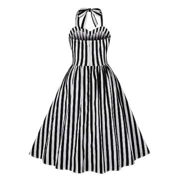 Show more Step into a world of vintage elegance with the stunning Halloween Costume Vintage 1950s Dresses for Women. This classic black and white striped dress is more than just an outfit; it's a tribute to the fabulous 50s, perfect for any retro-themed event or Halloween celebration. The dress features a sweetheart halter neck design, enhancing your silhouette while offering a comfortable fit. It is designed to evoke the retro glamour reminiscent of the 1950s, making it an ideal choice for those looking to embody the charm of a bygone era.