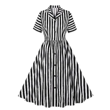 Step back in time with the **1950s Vintage Dress for Women**, a stunning homage to retro style that perfectly encapsulates the elegance and charm of the era. The striking **black and white vertical striped design** not only brings a classic vibe but also integrates a **modern twist**, ensuring you turn heads at any occasion. Its gracefully crafted **fit-and-flare silhouette** is expertly designed to highlight your waist, creating an alluring hourglass figure reminiscent of icons like Audrey Hepburn. Made...