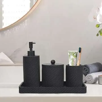 Show more Transform your bathroom into a stunning oasis with this exquisite 4 Piece Bathroom Accessory Set. Crafted from premium resin, this set includes a stylish soap dispenser, a compact toothbrush holder, a spacious q-tip holder, and an innovative vanity tray. Each piece is designed with both durability and elegance in mind, ensuring your bathroom not only functions efficiently but also looks extraordinary.