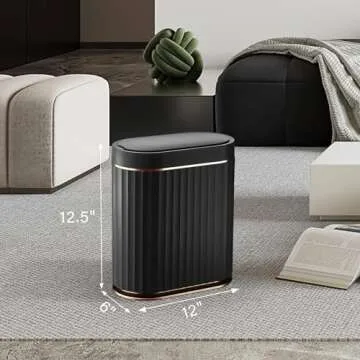Show more The ELPHECO Motion Sensor Trash Can is not just a receptacle for waste; it's a sophisticated addition to your home decor that combines advanced technology with a sleek design. Its striking black exterior provides a modern touch, making it an elegant feature in any room while also minimizing the visibility of dirt and stains. Specifically crafted for compact spaces, this bin measures 11 inches long, 7 inches wide, and 12 inches high, yet it boasts an impressive 2-gallon capacity—the perfect solution for bathrooms, bedrooms, or even RVs.