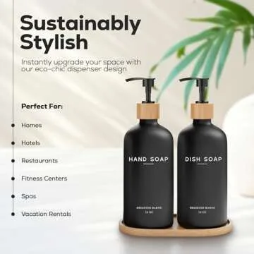 Black Glass Hand and Dish Soap Dispenser Set by Brighter Barns - Kitchen Soap Dispenser Set with Tray - Bamboo Soap Dispenser for Kitchen Sink - Modern Kitchen Decor, Boho Kitchen Decor (Black)