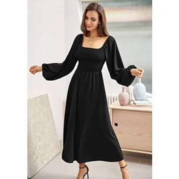 Black Long Sleeve Smocked Dress for Women Square Neck Split Flowy Dress, Black XXL