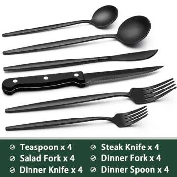 Black Silverware Set with Steak Knives, 24-Piece Stainless Steel Black Flatware Set for 4, Food-Grade Tableware Cutlery Set, Utensil Sets for Home Restaurant, Mirror Finish, Dishwasher Safe
