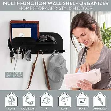 Black Solid Wood Mail and Key Holder for Wall Decorative Display - Includes Mail Holder, Shelf with Hooks for Keys & Pegs for Hanging Hats, Coats, Bags, Backpacks & More - Sleek Modern Design