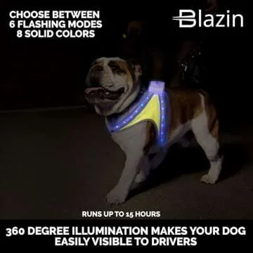 Show more The BLAZIN lighted dog harness is a revolutionary product designed to enhance your pet's visibility during nighttime walks, ensuring safety and style for both you and your furry friend. With individual bulbs integrated throughout, it provides the brightest night-time visibility, allowing your dog to be seen from up to 1,000 feet away. The harness features a large central bulb accompanied by four independent light strips that illuminate your dog brilliantly, making it a standout choice for pet owners who prioritize safety while walking at night.
