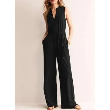 BLENCOT Jumpsuits for Women Dressy Summer Belted Romper Casual Sleeveless V Neck High Waist Wide Leg One Piece Outfits with Pockets Black S