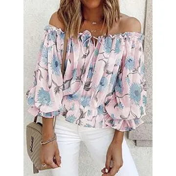 BLENCOT Womens Off The Shoulder Blouse Tops 3/4 Ruffle Sleeve Summer Floral Print T Shirts Pink M