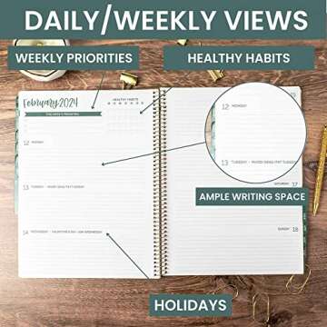 Featuring a layout that includes two-page monthly overview spreads and spacious weekly views, this planner helps you track priorities and habits with ease. The weekly layouts are designed to maximize writing space and present a clear view of your commitments. Premium features such as soft, lightweight covers made from thick cardstock with gloss film lamination make this planner not just durable but also a joy to hold.
