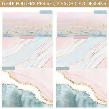 Show more Bring a splash of creativity to your organization with our exquisite pack of decorative file folders. This vibrant set includes six folders, featuring two of each captivating watercolor pattern, designed to enhance your workspace at school, home, or the office. Crafted from premium 400gsm paper, each folder boasts a durable matte coating that not only protects your papers but also adds a touch of elegance to your filing system.