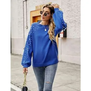 Blooming Jelly Women's Chunky Sweater Crewneck Sweatshirt Knit Lantern Sleeve Oversized Pullover Sweater with Pearls (Medium, Royal Blue)
