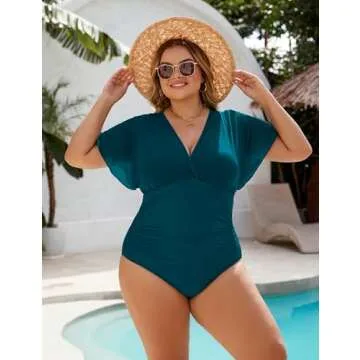 Show more Experience the ultimate blend of style and comfort with the Blooming Jelly Women's Plus Size Swimsuit, the perfect one-piece bathing suit designed specifically for curvy women. Offering a sophisticated look in a beautiful dark cyan color, this swimsuit features a flattering v-neck and delicate mesh butterfly sleeves that elevate your swimwear game. Made with soft full lining, it ensures not only comfort but also vital skin protection against harsh sun rays. The adjustable straps and removable padded bras allow for a customized fit, ensuring you feel confident and chic while you enjoy your favorite water activities.