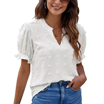 Show moreIntroducing the Blooming Jelly Women's Puff Sleeve Casual Top, a delightful fashion piece that encapsulates the essence of summer style. Crafted from exquisite chiffon, this stunning blouse offers a lightweight and breathable quality perfect for warm sunny days. The blend of playful yet elegant elements such as puff shoulders, Swiss dots, and ruffle sleeves creates a top that is not only chic but also incredibly comfortable. With a chic V neckline, this blouse gracefully accentuates your neckline while providing ample coverage around the arms, making it ideal for any occasion where you want to look effortlessly stylish.