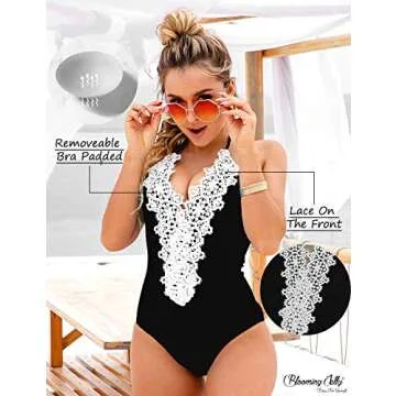 Introducing the Blooming Jelly Women's Vintage One Piece Swimsuit - where retro charm meets modern comfort! This beautifully designed bathing suit is made from a blend of spandex and polyester, ensuring a lightweight and quick-drying fabric that feels soft against your skin. The plunge neckline coupled with intricate lace detailing on the front adds a flirty touch, while the self-tie feature on the back allows for a customizable and secure...
