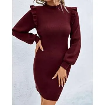 Show more Meet the Blooming Jelly Women's Mini Sweater Dress, your go-to choice for this season of style and comfort. Crafted with a luxurious blend of fabrics, this dress features a soft, skin-friendly, and stretchy knit that not only hugs your body but also enhances your natural curves. The delightful vertical ribbed texturing adds elegance, making it perfect for all your fall and winter events. With its chic mock neckline and long puff sleeves, the dress offers a stylish yet cozy silhouette that effortlessly transitions from day to night. At a mid-thigh length, it exhibits a fashionable bodycon fit that complements any figure, ensuring you feel confident and stylish during every outing.