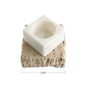 Crafted from two durable and natural materials, marble and travertine, this candle holder boasts a smooth and polished surface that enhances its aesthetic appeal. With dimensions of 3.25 inches in both length and width and a height of 2.5 inches, it is designed to fit comfortably on tables, shelves, or mantels without taking up too much space.