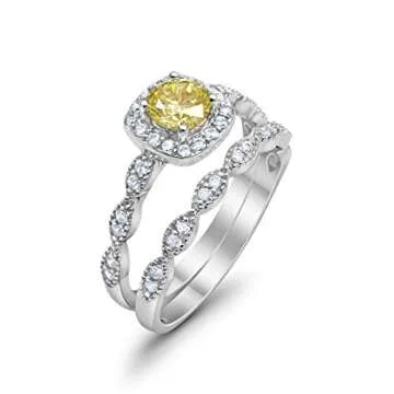 Show moreIntroducing an exquisite piece that captures the essence of elegance and sophistication: the Blue Apple Co. Art Deco Vintage Design Halo Wedding Engagement Bridal Set Ring Band. This stunning ring is a perfect fusion of classic design and modern allure, featuring a captivating round simulated fancy canary yellow cubic zirconia set in a delicate halo of sparkling stones. Measured at 8mm (0.31"), this ring sits gracefully on your finger, making it ideal for every day and special occasions alike.