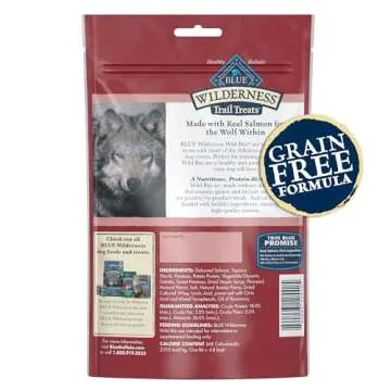 Show more Introducing the BLUE Wilderness Trail Treats Wild Bits Salmon Recipe, the ultimate treat that will have your furry friend wagging their tail with joy! Crafted by the trusted brand Blue Buffalo, these delectable dog treats put real meat first, featuring salmon as the primary ingredient. Your canine companion will be captivated by its rich flavor, making every training session a delight. These treats are not only tasty but are also grain-free, ensuring that they are suitable for dogs with dietary sensitivities. Unlike conventional treats, BLUE Wild Bits are made without chicken or poultry by-products, corn, wheat, or soy, assuring you of high-quality ingredients that support your dog's health.