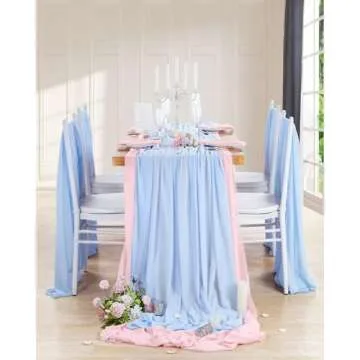 Show moreTransform your event into an unforgettable experience with our exquisite Blue Chiffon Table Runner. Measuring an impressive 27 inches in width and 120 inches in length, this elegant table runner is designed to cater to tables accommodating 6 to 10 seats. Made from 100% high-quality polyester, this soft chiffon fabric brings an air of romance and sophistication to your decor. Its dreamy flow creates a captivating backdrop for any occasion, wrapping your dining setup in a veil of elegance that's perfect for weddings, bridal showers, or any festive gathering.