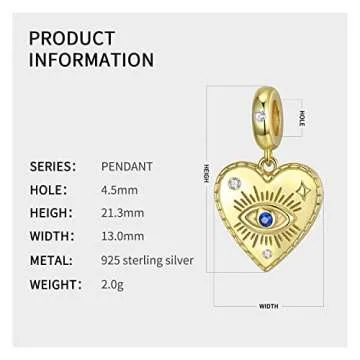Blue Evil Eye Bead Charms fits Pandora Charms Bracelets 925 Sterling Silver Lucky Charms Pendant Beads Jewelry Gift for Woman (Gold Plated Heart Evil Eye Dangle)