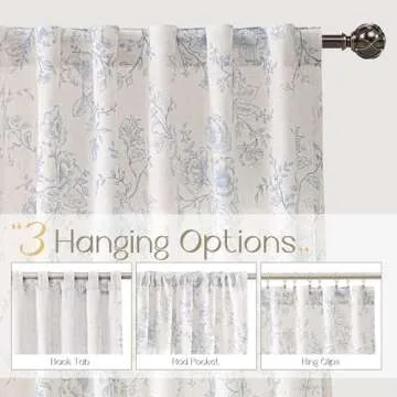 Show more Transform your living space with our exquisite floral linen curtains, a stunning addition to any home decor. Each package includes two panels measuring a generous 52 inches wide by 108 inches long, perfect for larger windows that need a touch of elegance. Crafted with care, these curtains feature a unique design that allows you to style them in three different ways: using back loops for a beautiful pleated effect, a classic 3-inch rod pocket, or clip rings for smooth operation (please note, clip rings are not included).