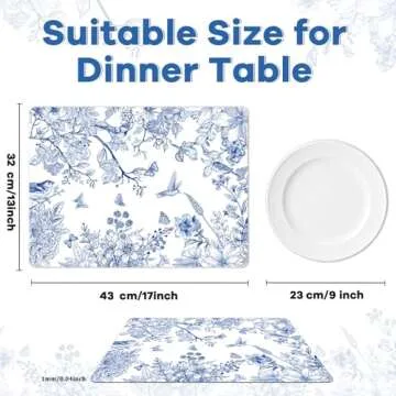 Blue Floral Placemats Set of 6 Flower Bird Plastic Table Mats Seasonal Spring Placemats Chinoiserie Table Mats Rustic Vintage Table Decoration for Indoor Outdoor Party Kitchen Dining Table