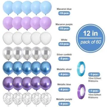 Show moreElevate your celebrations with our Blue Purple Balloons Set! This vibrant collection of 60 high-quality latex balloons includes an eye-catching assortment that will transform any event into a festive wonderland. Featuring 15 macaron blue, 15 macaron purple, 13 white, 5 metallic silver, 4 metallic blue, 4 metallic purple, and 5 confetti-filled balloons, this set is perfect for creating stunning displays and beautiful backdrops for memorable photos. From birthday parties to baby showers, these balloons add a touch of magic to any occasion!
