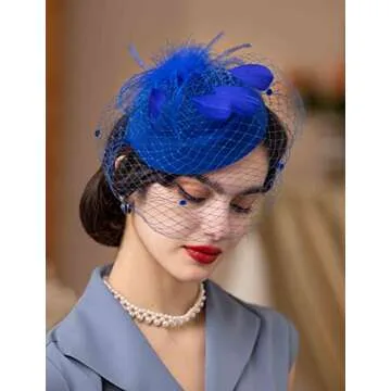 Show more Step into the spotlight with this exquisite royal blue vintage fascinator that transcends mere fashion and becomes a statement of elegance. Crafted with meticulous attention to detail, this beautiful hat by ZIVYES is perfect for anyone looking to elevate their outfit with a touch of sophistication. Made from high-quality materials including feathers, luxe brocade, and delicate netting, this fascinator features a charming birdcage veil that adds a hint of mystery and allure.