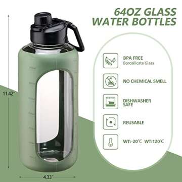 BLUEGO 64oz Glass Water Bottles with 2 Lids Half Gallon Water Bottle with Straw 2 Liter Large Water Bottle with Time Ounce Markings Silicone Sleeve Water Jug for Gym, Home, Office, BPA-free,Olive